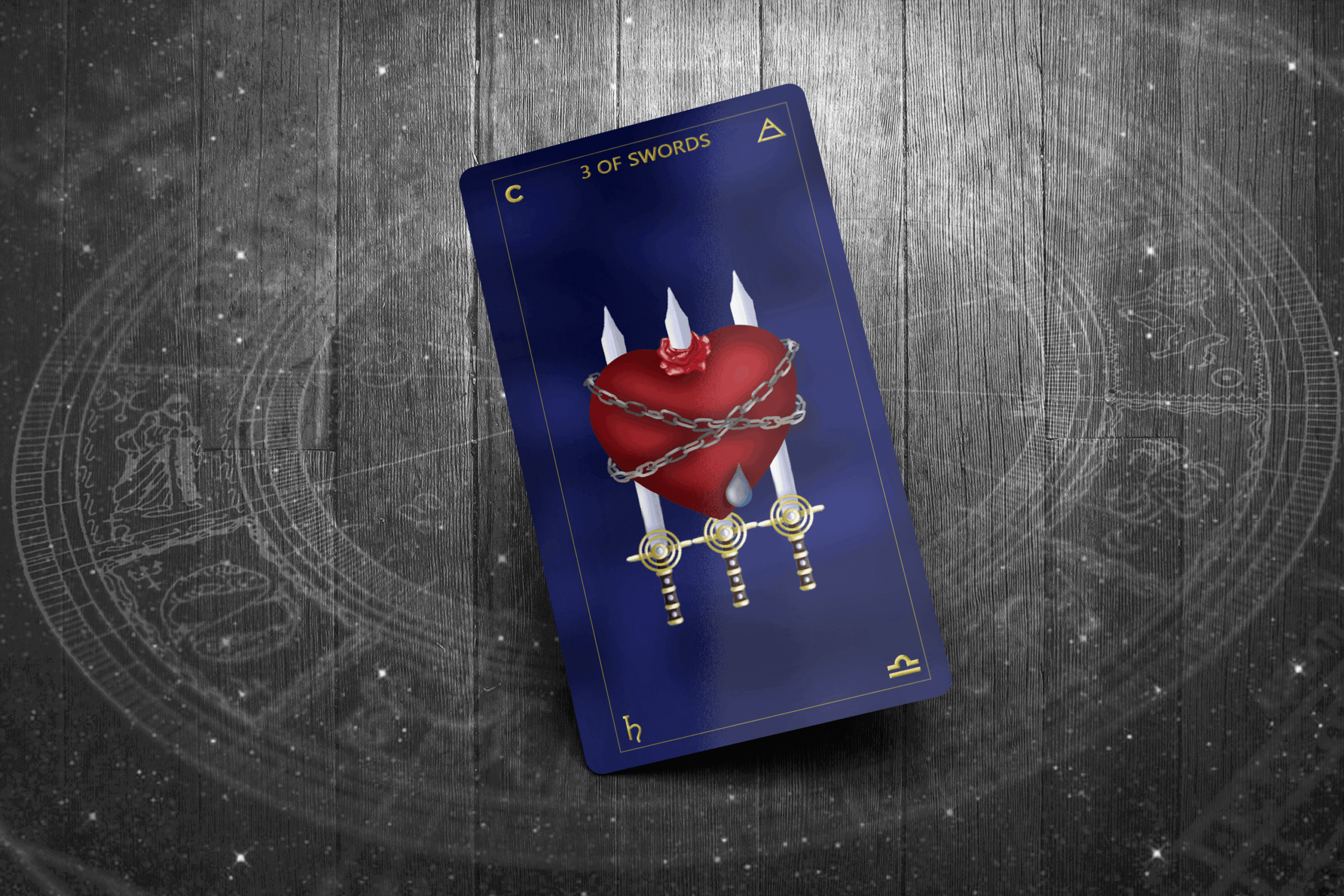 In the Thoth Tarot, the 3 of Swords is subtitled “Sorrow”, reflecting the heaviness and unavoidable emotional pain this card represents.