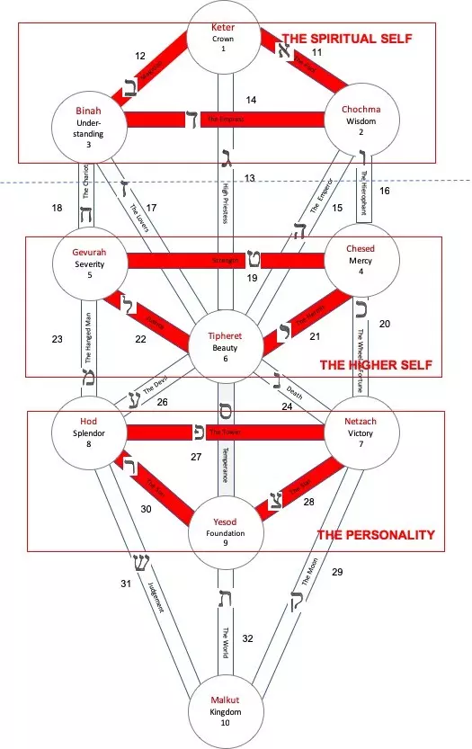 Unlike The Fool, who descends into the realm of Malkut, the human spiritual journey begins in Malkut and follows the Major Arcana’s paths up through the Tree of Life’s structure.